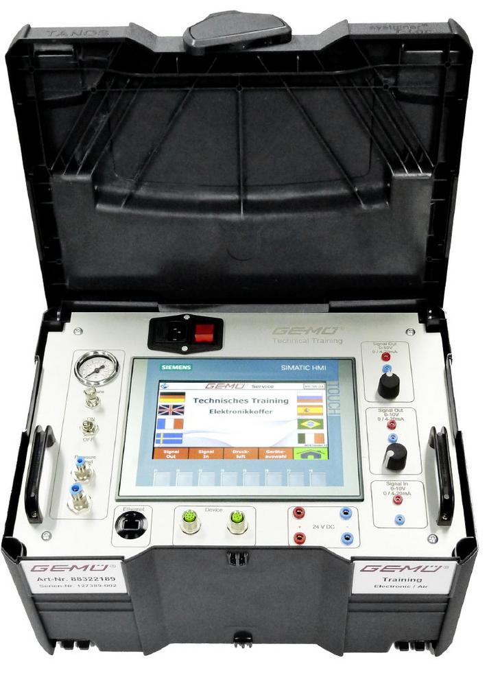 Der neue SPS-gestützte GEMÜ Multifunktionskoffer dient dem von Anlagen unabhängigen Betrieb, der Programmierung und der Initialisierung der an Prozessventile angebauten Automatisierungsgeräte. Hierzu zählen beispielsweise elektrische Stellungsrückmelder, Ventilanschaltungen sowie elektronische und elektropneumatische Regler. Das Multifunktionsgerät ist insbesondere auf die GEMÜ Automatisierungstechnik abgestimmt. Es können aber auch Geräte und Produkte anderer Hersteller daran angeschlossen werden. Hierfür verfügt der Koffer seriell zusätzlich über frei wählbare Eingangs-/Ausgangssignale 0-10V, 0-20mA und 4-20mA sowie eine Geräteversorgung von 24 V/DC und ein Ethernet-Interface. Auch Sensoren und Messumformer können mit dem Gerät kommunizieren. Der Multifunktionskoffer eignet sich auch für die Schulung von technischem Personal z.B. der Instandhaltung und der Anlagenwartung. Das Gerät ist kompakt, für einen häufigen Transport optimiert und äußerst robust ausgeführt. Die sichere Bedienbarkeit, auch von nur wenig routinierten Personen, ist gegeben. Der GEMÜ MSR-Funktionskoffer verfügt über eine speicherprogrammierbare Siemens-Steuerung (SPS) und ist mit einem Industrie-Touch-Screen-Display ausgestattet. Die übersichtliche grafische Display-Darstellung gewährleistet die intuitive Bedienung auch für wenig geübte Nutzer. Acht auf der Startseite frei wählbare Sprachen ermöglichen den internationalen Einsatz (D, GB, F, S, RUS, ES, BR, IT). Im Funktionskoffer ist ein Kleinkompressor sowie ein Druckspeicher integriert – dies ermöglicht die unabhängige pneumatische Versorgung angeschlossener Geräte kleiner bis mittlerer Nennweite/Größe. Bewusst wurde darauf verzichtet, die Benutzeroberfläche mit unnötigen Informationen zu überladen. Dadurch ist die Displaydarstellung übersichtlich und der Bediener im Menü gut orientiert. Mit dem Funktionskoffer werden die für den Betrieb mit GEMÜ Produkten notwendigen Kabel seriell vorkonfektioniert ausgeliefert. Für den Betrieb von Geräten anderer Hersteller können Kabel optional bereitgestellt werden. Der MSR-Koffer arbeitet mit einer Betriebsspannung von 100V/AC bis 240 V/AC und ist dadurch in allen gängigen Stromnetzen weltweit einsetzbar. Als Gehäuse und für den Transport wurde das stabile aus ABS gefertigte TANOS-Koffer-System gewählt. Die Koffer lassen sich sicher stapeln und sind untereinander verriegelbar.