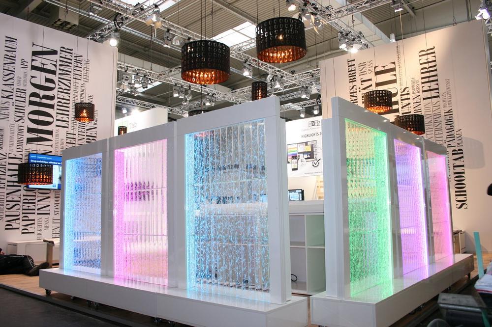 Wer seinen Messebesuchern eine angenehme Atmosphäre für Smalltalk oder Verkaufsgespräch bieten möchte, dem empfiehlt Frank Möller Leder-Loungemöbel. Diese gibt es als rein-weiße oder schwarze Lounge, als drehbaren Sessel oder variables Modulsofa. „Wenn sich Ihre Gäste bei Ihnen am Stand wohlfühlen, wirkt sich das natürlich auch positiv auf Ihre Verhandlungsposition aus“, sagt der Loungemöbel-Experte augenzwinkernd. Um den zahlreichen Besuchern ins Auge zu fallen, empfiehlt Möller einen Wow-Effekt. „Besonders gut dafür geeignet sind LED-beleuchtete Wasserwände. Diese dienen sowohl als Hingucker als auch als optische Abgrenzung Ihrer Messe-Lounge.“