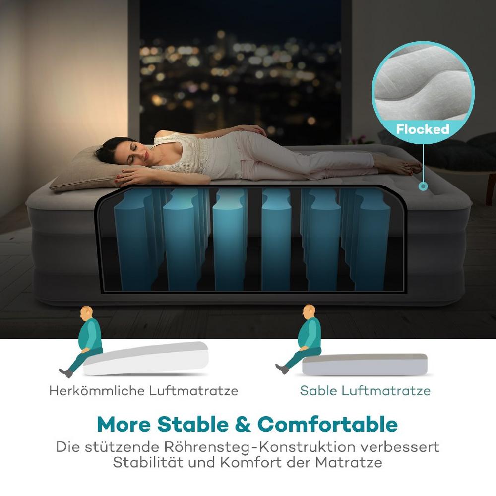 Die Sunvalley-Group bringt ein neues innovatives Produkt auf den Markt: das komfortable Queen Size Gästebett von Sable kann dank der 130W leistungsstarken internen Luftpumpe schnell und mühelos in nur drei bis fünf Minuten aufgepumpt werden. Entsprechend der Dauer des Aufpumpens erhält das Luftbett die gewünschte Festigkeit, die für einen regenerierenden Schlaf sorgt. Somit ist es ideal für spontane Übernachtungsgäste oder eine Reise mit begrenzten Übernachtungsmöglichkeiten, sowie ein Nickerchen im Garten geeignet.