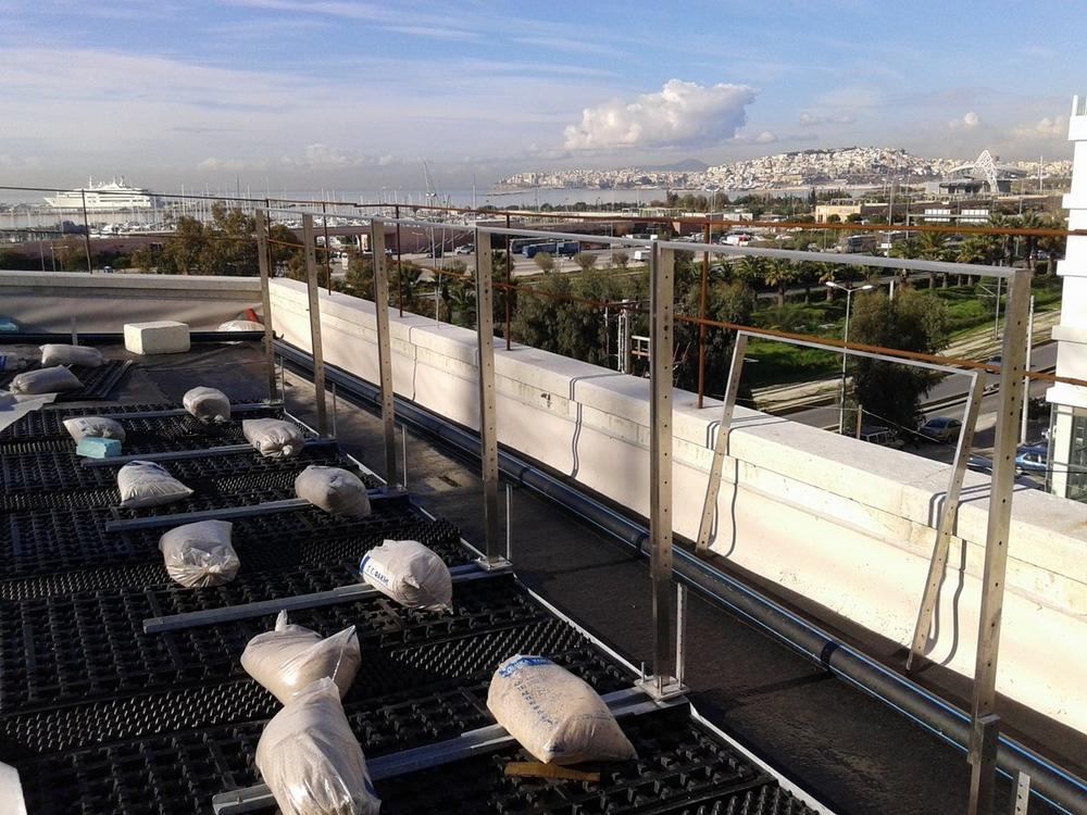 Die Ausführung der Dachbegrünungsarbeiten verlief sehr vorbildlich, so waren straffe Organisation und Sauberkeit auf der Baustelle augenscheinlich. Grundlage auf den bis 5° geneigten Betondächern war stets eine wurzelfeste bituminöse Abdichtung. Verwendet sind auf den Gebäuden aber objektspezifisch unterschiedliche ZinCo-Systemaufbauten. So sind die griechische Nationalbibliothek und die griechische Nationaloper als Umkehrdächer ausgeführt und erforderten diffusionsoffene Systemaufbauten.