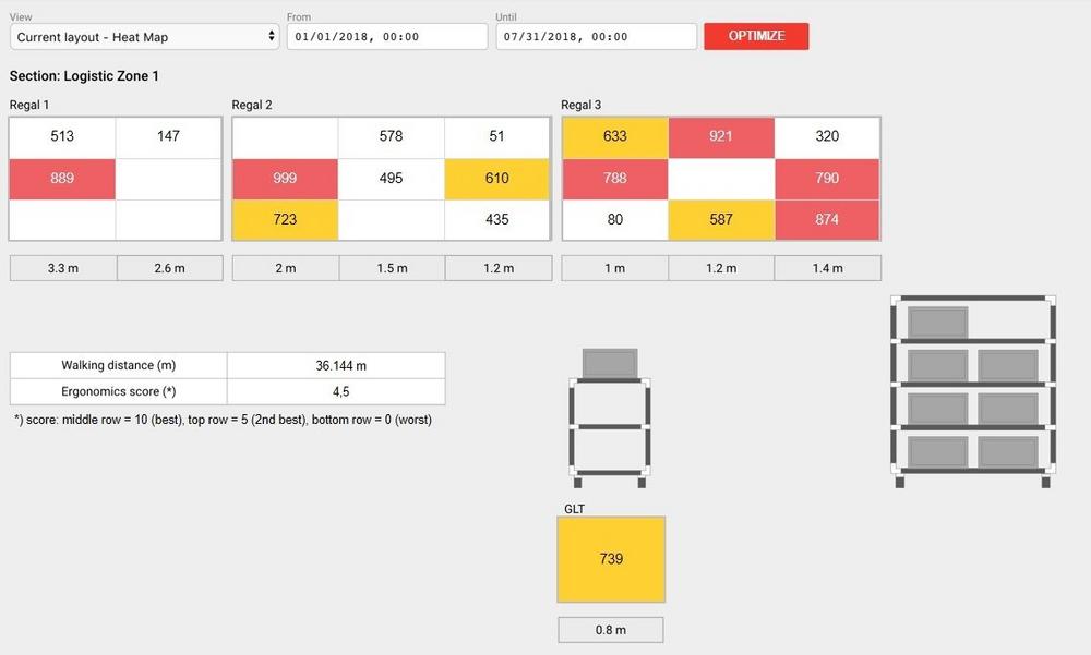 Auf dieser Datenbasis arbeitet der neue PickExplorer. Anhand der erhobenen Informationen können die Picks ausgewertet werden, beispielsweise hinsichtlich Pick-Häufigkeit, Laufwegen, Durchlaufzeiten und Ergonomie. Die Zone wird grafisch so dargestellt, das die schnelle Erfassung des Prozessablaufs möglich ist. Auf Knopfdruck lässt sich ein optimiertes Layout errechnen. Im Anschluss kann der Optimierungsvorschlag als neue Konfiguration übernommen werden.