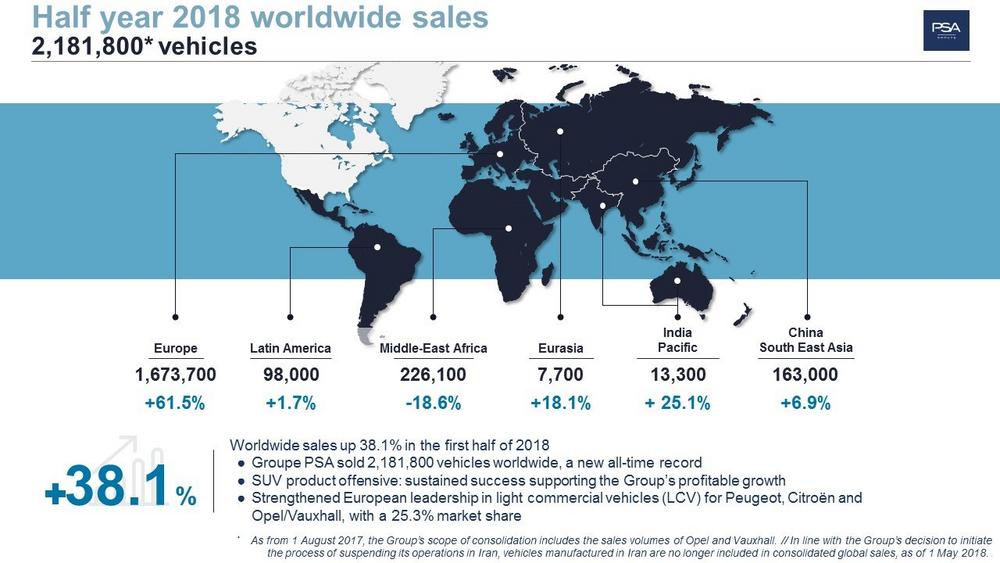 • Groupe PSA verkauft weltweit 2.181.800 Fahrzeuge1: ein neuer Rekord und ein Anstieg von 38,1 Prozent gegenüber dem ersten Halbjahr 2017
