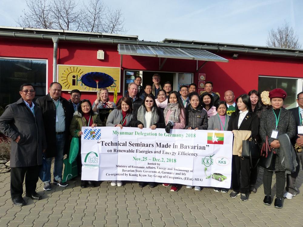 Weißenohe: Schon zum 6 .Mal befindet sich eine Delegation aus Myanmar in der Bundesrepublik um den Wissenstransfer von erneuerbaren Energien zu fördern. Die bayerische Staatsregierung unterstützt diese Bemühungen und hat damit der Kaung Kyaw Say-Gruppe (KKS) dazu verholfen den „Asian Energy Award 2016“ für ihre Solar- und PV-Dachsysteme zu gewinnen. Seitdem herrscht ein reger Austausch zwischen Myanmar und Bayern unter Beteiligung der bayerischen Wirtschaft. Organisiert werden die Besuche der Spitzenkräfte aus dem fernöstlichen Staat vom internationalen Bereich der beruflichen Fortbildungszentren der Bayerischen Wirtschaft mit Sitz in Hof. Die Projektkoordinatorin Angie Dröber besuchte mit 21 Delegationsmitgliedern auch die Firma iKratos in Weißenohe, um sich dort über neue Entwicklungen im Hinblick auf Photovoltaik und neuer Speichermöglichkeiten zu informieren. Herr Willi Harhammer, Geschäftsführer der iKratos GmbH hat die Delegation persönlich empfangen und Sie mit einem interaktiven Vortrag sowie einer Firmenführung begeistert. Die Delegationsmitglieder, alle in Spitzenpositionen führender Wirtschaftsunternehmen in den drei Regionen Yangon, Mandalay und Bagan in Myanmar, zeigten sich sichtlich beeindruckt von den neuesten Erfahrungen die ihnen der Geschäftsführer der iKratos Solar Energietechnik GmbH Willi Harhammer vermitteln konnte. Hiung Naing Aung der Vorstandsvorsitzende (CEO) der KKS betonte ausdrücklich, dass die „Myanmar-German Energy week 2017“ einen Meilenstein im Hinblick auf die Einsparung von Energie für sein Land bedeutet hat und die wirtschaftlichen Beziehungen zwischen beiden Ländern weiter ausgebaut werden sollen. Insbesondere die „Technical Seminars Made in Bavarian“ so der einflussreiche Wirtschaftsfachmann aus Myanmar wört-ich, „würden einen unverzichtbaren Gewinn an neuen Erkenntnissen auf dem Gebiet der PV ausmachen.“ Die Besuchsreihe soll auch in den zukünftigen Jahren fortgeführt werden so der einflussreiche Wirtschaftsfachmann aus Myanmar. Er dankte ausdrücklich der Bayerischen Staatsregierung für ihre Unterstützung und der bfz für ihre Hilfe bei der Umsetzung. Auch seitens der bayerischen Staatregierung, so ergänzte die Projektkoordinatorin Angie Dröber soll an den regelmäßigen Austauschbesuchen festgehalten werden.
