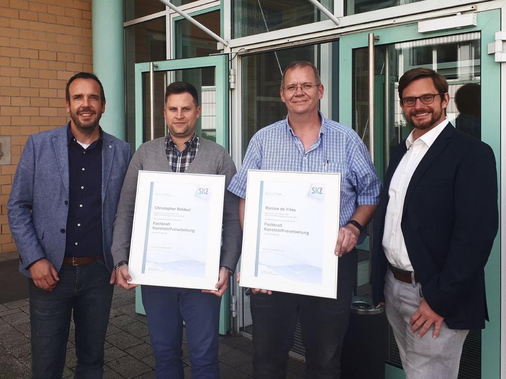 Den Erfolg dieses Konzepts rund um den SKZ-Kunststoff-Pass zeigen die ersten Abschlüsse zur Fachkraft Kunststoffverarbeitung bereits ein Jahr nach dem Startschuss der SKZ-Akademie. Marcus De Vries von der Südkabel GmbH und Christopher Baldauf von der Maschinenfabrik Reinhausen GmbH begannen ihre individuelle Weiterbildung mit den Basics. Sie belegten Einstiegskurse zur Werkstoffkunde, zur Verarbeitung von Kunststoffen und zur Materialbereitstellung. Diese Kurse ebneten den Weg für vertiefende, praxisnahe Wahlmodule zur Extrusion und zum Spritzgießen. Kurse, die direkt auf die Tätigkeitsbereiche der Teilnehmer in ihren jeweiligen Unternehmen zugeschnitten waren. Die anspruchsvolle schriftliche Abschlussprüfung bestanden beide Absolventen dank der erstklassigen Ausbildung ohne Probleme.