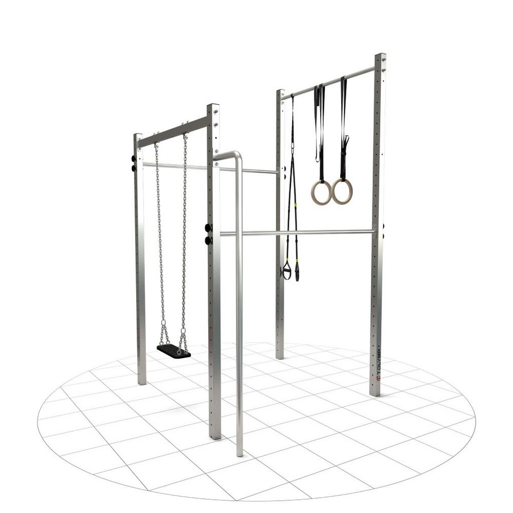 Das Grundkonzept der Station umfasst vier im Quadrat aufgestellte Pfosten. Diese besitzen jeweils eine Höhe von 240cm, auf Wunsch auch in einer höheren Ausführung in 300cm. Alle Pfosten verfügen ab 15 cm Höhe bis zum oberen Ende über stufenweise versetzbare Turnstangen. Wie bei TOLYMP üblich, lassen sie sich durch professionelle Schnellverschlüsse einfach und sicher dem Bedarf des Benutzers in der Höhe anpassen.