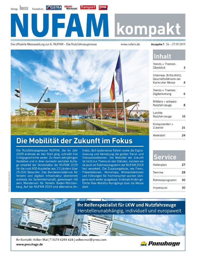 Die Redaktionen Transport, LOGISTRA, PROFI Werkstatt und Unterwegs unter der Leitung von Chefredakteur Torsten Buchholz sind auch in diesem Jahr von der Messe Karlsruhe mit der Erstellung und Distribution beauftragt worden. „Die NUFAM feiert in diesem Jahr ihr 10-jähriges Jubiläum seit ihrer Gründung im Jahr 2009 und ist für das Jahr 2019 eindeutig die Nummer 1 der Nutzfahrzeug-messen auf dem deutschen Markt. Daher sind wir gerne als Medienpartner und der NUFAM kompakt in diesem Jahr wieder dabei, so Bert Brandenburg, Geschäftsführer HUSS-VERLAG.“