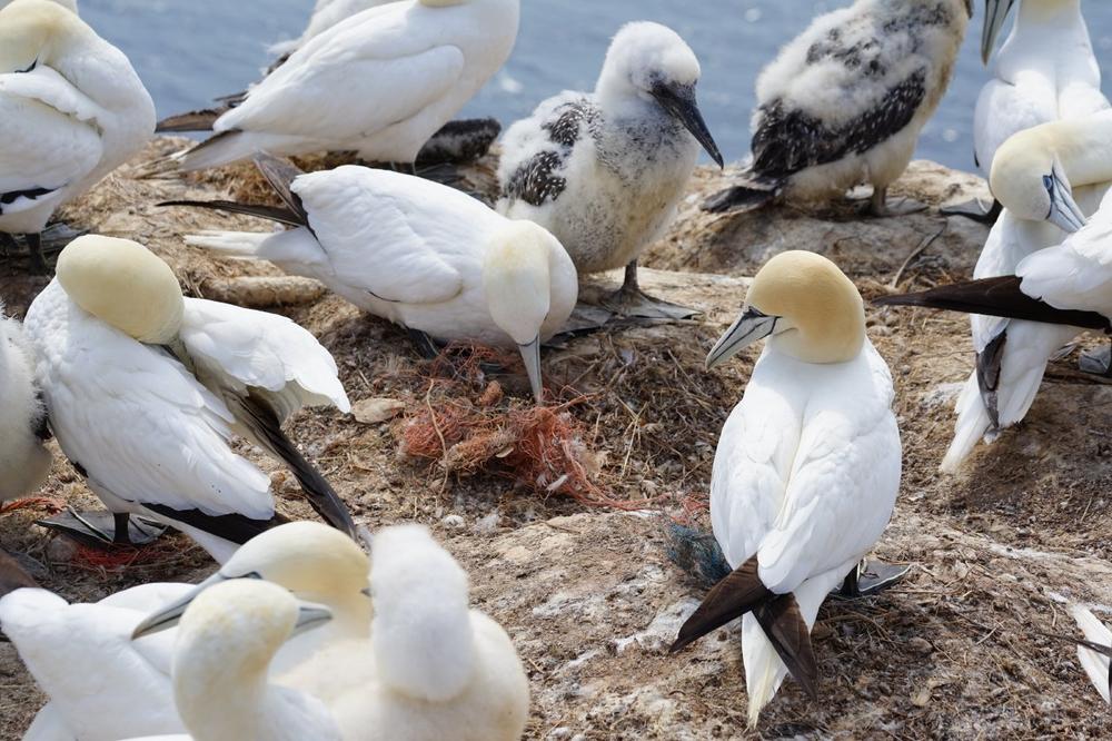 Helgoland liegt etwa 50 Kilometer vor der deutschen Nordseeküste und beherbergt ein deutschlandweit einzigartiges Habitat für Hochseevögel, Kegelrobben und Tangwälder in insgesamt drei Naturschutzgebieten. Eines dieser Schutzgebiete ist der Lummenfelsen, an dem Basstölpel, Trottellummen und drei weitere Hochseevogelarten von März bis Juli brüten und ihre Jungtiere groß ziehen. Auch hier ist zu erkennen, dass die Natur nicht von Müll verschont bleibt, darunter auch Kunststoff. Sogenanntes Makroplastik (> 5 mm), das an der Meeresoberfläche treibt, wird vor allem von Basstölpeln und Trottellummen als Nistmaterial in deren Nester eingetragen. Sowohl alte als auch junge Vögel können sich in den künstlichen Materialien verheddern und sind dann meist nicht mehr in der Lage, sich selbst zu befreien. Dies kann letztendlich zum Tod der Tiere führen.