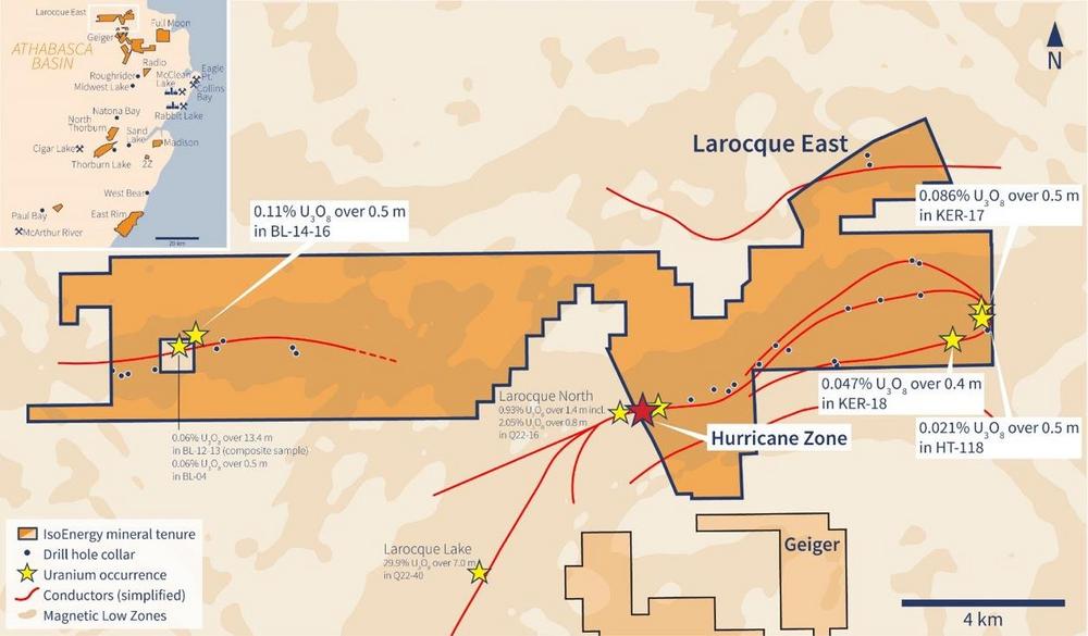 Zusammen mit anderen Zielgebieten umfasst das Grundstück eine 15 Kilometer lange nordöstliche Erweiterung des Leitungssystems des Larocque Lake; ein Trend von graphitischen metasedimentären Kellergesteinen, der mit einer signifikanten Uranmineralisierung in der Hurricane-Zone und in mehreren Vorkommen auf dem benachbarten Grundstück von Cameco Corp. im Südwesten von Larocque East verbunden ist. Die Hurricanezone wurde im Juli 2018 entdeckt und mit einer 12-Loch-Bohrkampagne im Winter 2019 sowie einer kürzlich abgeschlossenen 17-Loch-Sommerbohrkampagne fortgesetzt. Die Abmessungen sind derzeit 500 m lang, 40 m breit und bis zu 10 m dick. Die Zone ist offen für Erweiterungen während des Schlages und auf den meisten Abschnitten. Die Mineralisierung ist polymetallisch und erstreckt sich häufig über die Diskordanz unter Athabasca 320 m unter der Oberfläche. Die Bohrungen in der Larocque Lake Zone der Cameco Corp. auf dem benachbarten Grundstück im Südwesten haben historische Kreuzungen von bis zu 29,9% U3O8 über 7,0 Meter in Bohrloch Q22-040 ergeben. Wie das nahe gelegene Grundstück Geiger liegt Larocque East angrenzend an die Übergangszone Wollaston-Mudjatik – eine wichtige Krustennaht, die mit den meisten der großen Uranvorkommen im östlichen Athabasca-Becken zusammenhängt. Wichtig ist, dass die Sandsteinabdeckung auf dem Grundstück dünn ist und bei früheren Bohrungen zwischen 140 und 330 Metern liegt. Zusätzlich zur Entdeckung der Hurricane-Zone haben bisher vier historische Bohrlöcher eine schwache Uranmineralisierung an anderen Stellen der Liegenschaft durchschnitten.