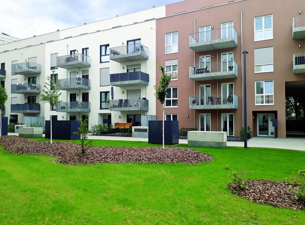 Die Gestaltung mit Solitärbäumen und Strauchpflanzungen inmitten ausgedehnter Rasenflächen verleiht dem Wohnquartier einen weiträumigen Ausdruck. Inmitten des vielfältigen Grüns – insgesamt 20 verschiedene Arten – laden Sitzbänke und Spielplatzgeräte Jung und Alt zum Aufenthalt ein.