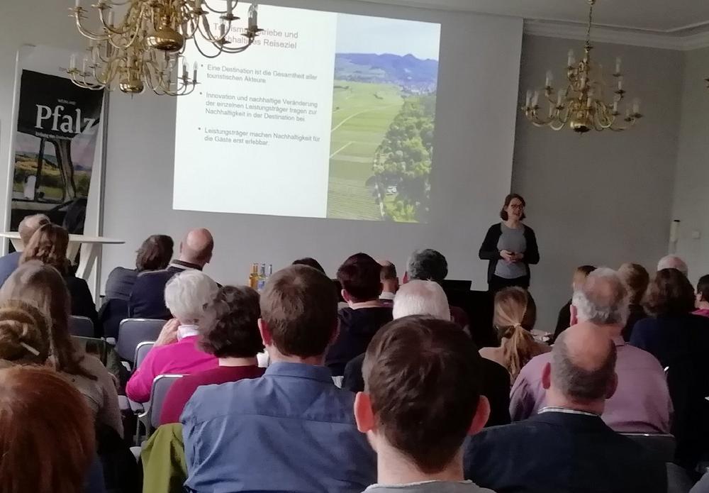 Die Anwesenden erfuhren durch den Nachhaltigkeitscoach Martin Balas von der begleitenden Agentur TourCert, was Nachhaltigkeit für Tourismusregionen bedeutet und welche Möglichkeiten sich durch die Zertifizierung als „Nachhaltiges Reiseziel“ für die Urlaubsregion Deutsche Weinstraße bieten: Wesentlicher Bestandteil des Zertifizierungsprozesses ist der Aufbau eines Partnernetzwerkes von Übernachtungsbetrieben, Gastronomen, Winzern, Direktvermarktern und Freizeiteinrichtungen.