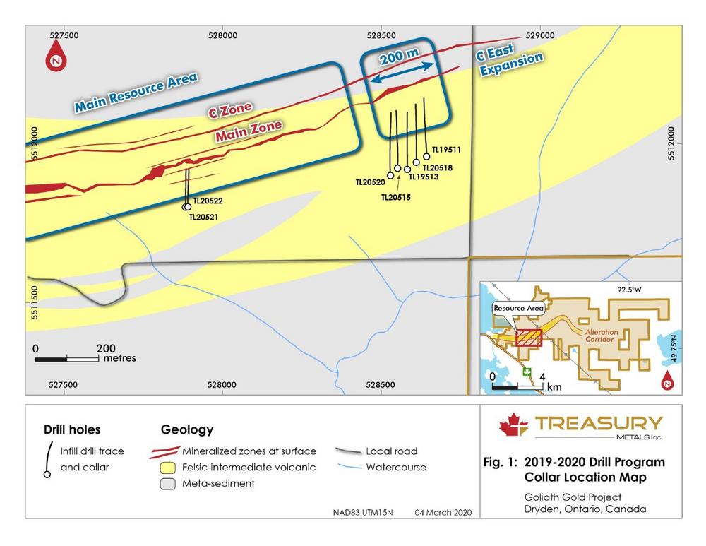 Die Bohrungen treffen weiterhin auf aussagekräftige Goldgehalte in einem neu entdeckten Mineralisierungsgebiet entlang des Streichs (siehe Pressemitteilung vom 13. Januar 2020). Diese Abschnitte werden bei der Ausrichtung auf die C-Zone Ost angetroffen und befinden sich etwa 200 Meter entlang der Streichlänge des östlichen Hauptzonenschießens. Der Entdeckungsschnitt umfasste eine Reihe von hochgradigen Linsen (TL19-506: 14,6 g/t Au über 1,0 m, 11,8 g/t über 1,0 m und 8,13 g/t über 1,0 m).