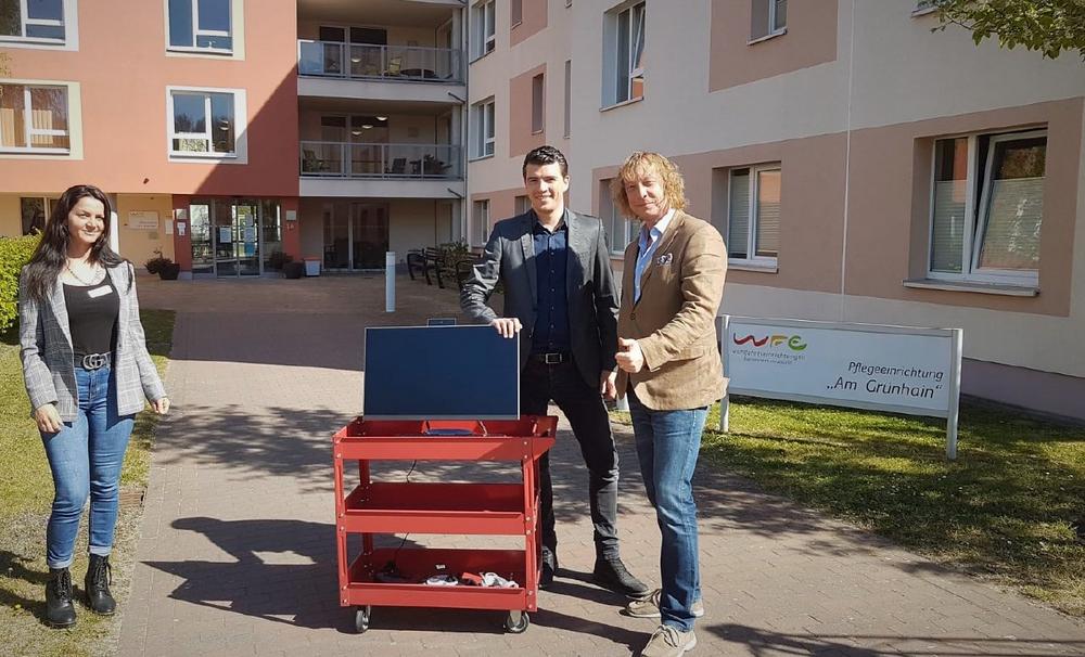 Um hier Abhilfe zu leisten und Nähe möglich zu machen, hat sich der Media Markt Stralsund als direkter Nachbar und Mitglied des gemeinsamen Werbeverbundes entschlossen, den Menschen in den Wohlfahrtseinrichtungen einen All-in-One PC mit Rollwagen als Leihgabe zur Verfügung zu stellen. Dieser PC ermöglicht den Bewohnerinnen und Bewohnern, mit ihren Familien über Skype in Kontakt zu treten, sich zu sehen und miteinander zu sprechen. Durch den beigefügten Rollwagen können die Pflegekräfte das Gerät bequem in die Zimmer schieben und bei der Bedienung behilflich sein.