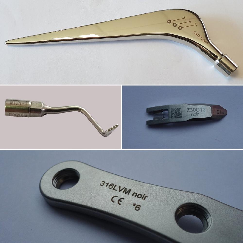 So unterschiedlich die einzelnen medizinischen Fachgebiete sind, so zahlreich sind auch die zu kennzeichnenden Komponenten. So müssen beispielsweise chirurgische Instrumente wie Skalpelle oder Operationsmesser ebenso gekennzeichnet werden wie Prothesen oder Orthesen aus Stahl, Kobalt, Keramik oder Biomaterial. Auch Zahnimplantate, die häufig aus Titan bestehen, sowie Hörgeräte oder Herzschrittmacher sind nach strengen Vorgaben zu beschriften.