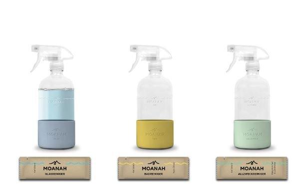 Moanah bietet nachhaltige Reinigungsmittel als Refills in Glasflaschen an. Die Sprühflaschen werden zu Hause einfach mit Wasser aufgefüllt, das Pulverkonzentrat eingeschüttet und nach wenigen Sekunden ist der Reiniger einsatzbereit. Sobald die Konzentrate leer sind, können sie per Brief nachbestellt werden.
