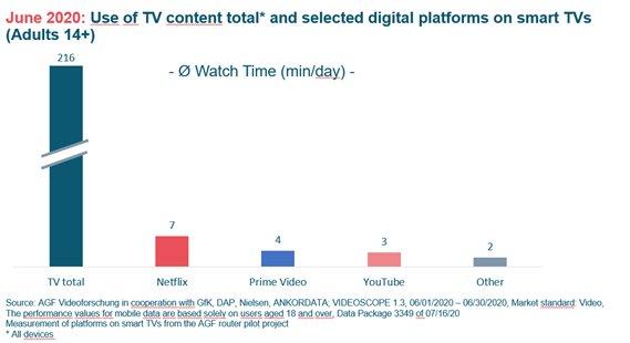 In the first report for the month of June 2020 available now, Netflix reached an average daily watch time of 7 minutes on smart TVs among viewers aged 14 and older. Amazon’s streaming service Prime Video was watched on TV sets for a daily average of 4 minutes, YouTube for 3 minutes. By comparison, this target group’s average usage of TV content (linear and non-linear) across all terminal devices in June was 216 minutes per day. “Thus, traditional TV content accounts for the greatest share of use by far,” said Kerstin Niederauer-Kopf. AGF also wants to measure the use of streaming services on other Internet-capable terminal devices in the future.