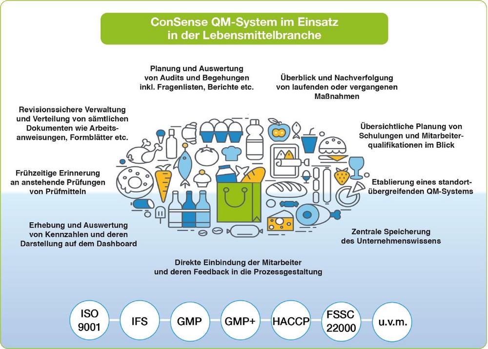 Eingesetzt als Integriertes Managementsystem, bildet ConSense Software alle für das Unternehmen zutreffenden Normen und andere Regelwerke unter einer einheitlichen Oberfläche ab, so z. B. die Vorgaben nach DIN EN ISO 9001, IFS, GMP, FSSC 22000 und mehr. Die QM-Software für die Lebensmittelindustrie wird flexibel für die spezifischen Belange und Anforderungen des Unternehmens konfiguriert. Unternehmen aus der Lebensmittelbranche profitieren von einer schnellen und einfachen Abbildung ihrer Spezifikationen, Rezepturen und Produktionsprozesse. Aktuelle und gültige Dokumente, wie Arbeitsanweisungen, Formblätter etc., werden vom QM-System nach Freigabe automatisch an die betreffenden Mitarbeiter, z. B. direkt in der Lebensmittelproduktion, verteilt. Das System unterstützt besondere Hygiene-Anforderungen durch CPs (Control Points) und CCPs (Critical Control Points). Es verringert den Verwaltungsaufwand durch ein zuverlässiges, revisionssicheres Dokumentenmanagement und die Automatisierung von Routineaufgaben. Für Audits und Kontrollen erforderliche Dokumente lassen sich auf Knopfdruck zusammenstellen. Das QM-System vereinfacht zudem den Aufbau eines systematischen Reklamationsmanagements, die Erfassung und Auswertung von Lieferantenbewertungen und vieles mehr. Die modular aufgebauten Softwarelösungen lassen sich durch Module wie ConSense Auditmanagement und ConSense Maßnahmenmanagement erweitern und damit perfekt auf die individuellen Bedürfnisse von Unternehmen aus der Lebensmittelbranche zuschneiden.