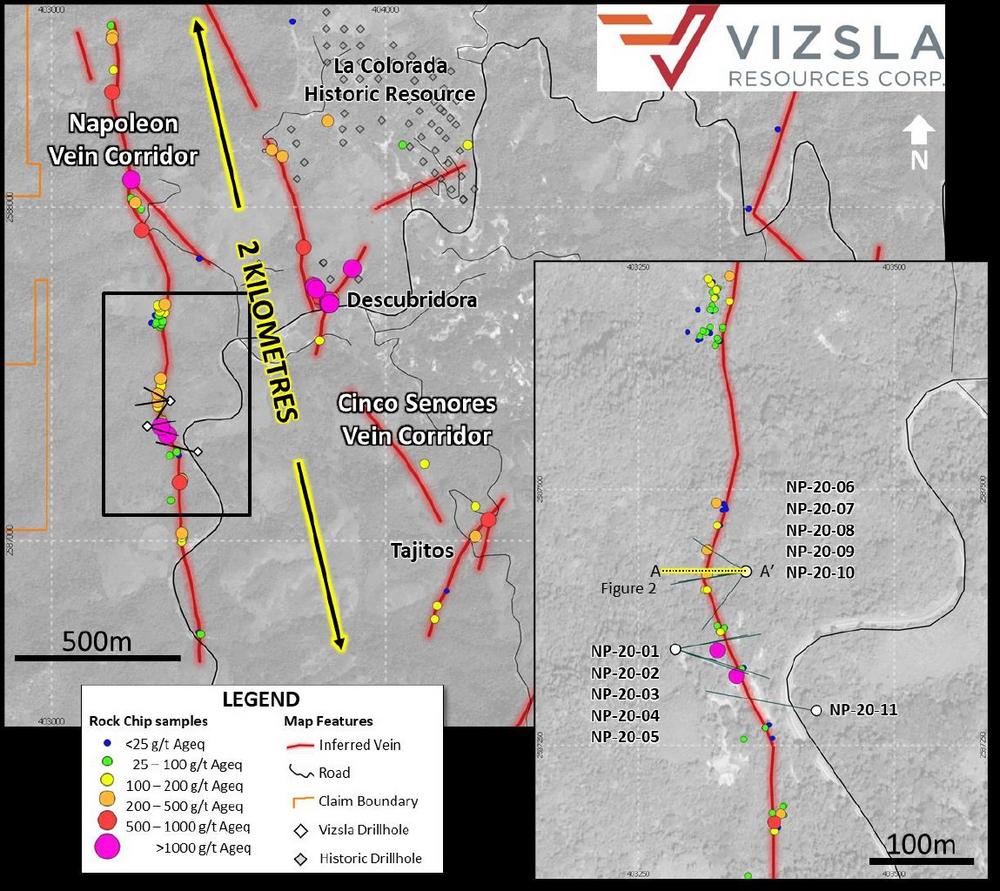 Der Napoleon-Venenkorridor befindet sich fast vollständig auf Konzessionen, die von Rio Panuco optioniert wurden. Vizsla hat das Recht, 100 % der Konzessionen zu erwerben, einschließlich der 500-Tonnen-Tagesmühle El Coco, einer Abraumhalde, Straßen, Stromversorgung und der Genehmigungen für insgesamt 23.000.000 US-Dollar.