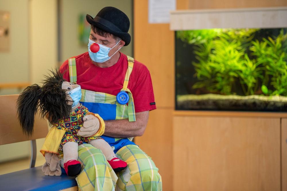 In den Krankenzimmern der Kinder bedeutet das Einhalten der Hygieneregeln besondere Achtsamkeit. Da ist es als Clown nicht leicht zu spielen, mit eingeschränkter Mimik und unter ständiger Beachtung des Mindestabstands. „Ein neues Konzept war nötig“, erklärt Dodo. „Weil Clowns auch Geschichten lieben, spiele ich in den Patientenzimmern jetzt Theater.“ Dabei verwandelt sich binnen weniger Sekunden ein alter Koffer in ein kleines Marionettentheater. Gemeinsam mit den Patienten wählt Dodo die Darsteller aus und die Vorstellung kann beginnen. Hauptprogramm ist derzeit eine Variante des „Froschkönigs“. Weil sich die Prinzessin wegen Corona aber weigert, den Frosch zu küssen, kommt es im Verlauf der Geschichte zu allerhand Komplikationen. „Da die Kinder Einfluss auf die Geschichte nehmen, kann es dem Prinzen durchaus passieren, wieder in einen Frosch zurückverwandelt zu werden“, schmunzelt Dodo.