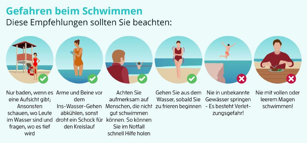 - Baden Sie nur, wenn es eine Aufsicht gibt – schauen Sie sonst, wo Leute im Wasser sind und fragen Sie, wo es tief wird.
