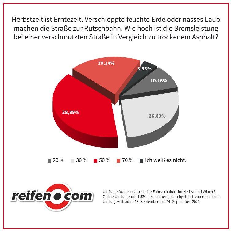 Eine Umfrage zum Thema „Fahrverhalten im Herbst und Winter“ im Auftrag von reifen.com deckte nun auf, dass nur rund 10 Prozent der Befragten die Haftung eines Reifens auf einer Straße mit nassem Laub und feuchter Erde (sog. „Bauernglatteis“) richtig einschätzen. Diese nimmt nämlich erheblich ab und beträgt auf derart verschmutztem Untergrund nur noch etwa 20 Prozent. Sichtbehinderungen durch Nebel sind gerade im Herbst ein Hauptgrund für Unfälle. Hier heißt es: Fuß vom Gas! Beträgt die Sichtweite weniger als 50 Meter, dürfen maximal 50 Stundenkilometer auf dem Tacho stehen – dafür darf dann aber auch mit Nebelschlussleuchte gefahren werden. Diese Regeln kannten 55 Prozent bzw. knapp 73 Prozent der Befragten.