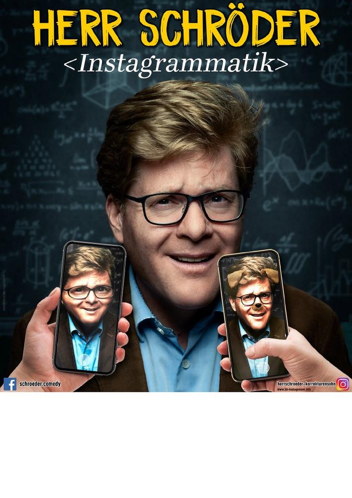 Herr Schröder ist wieder da! Ab Herbst 2020 geht der staatlich geprüfte Deutschlehrer mit seinem neuen Solo „<Instagrammatik> – Das streamende Klassenzimmer“ auf Tour. Vieles hat sich seither verändert an der Helene-Fischer-Gesamtschule: Der Medienwagen hat Netflix, die Schulbücher gibt’s als Podcast und bettlägerige Schüler werden per Livestream zugeschaltet. Außerdem ist freitags jetzt immer frei. Der Lehrermangel wird durch Youtube-Tutorials ausgeglichen: das Rezozialisierungsprogramm bringt bessere Klausur-Ergebnisse als je zuvor – das Kultusmysterium ist ratlos.