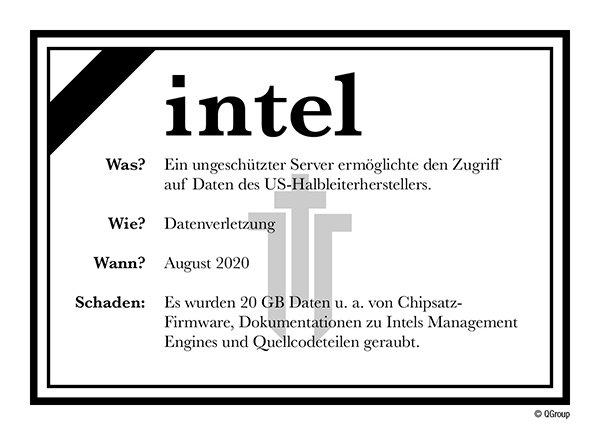 Von einem ungeschützten Server beim US-amerikanischen Chiphersteller Intel wurden über 20 GByte an Daten geleaked. Die Dateien stammen anscheinend aus dem Intel-Resourceand- Design-Center, in dem Informationen zur Verwendung durch Kunden, Partner und andere externe Parteien gespeichert sind, die sich für den Zugriff registrieren müssen. Enthalten sind u. a. Chipsatz-Firmware, Dokumentationen zu Intels Management Engines und Quellcodeteile.