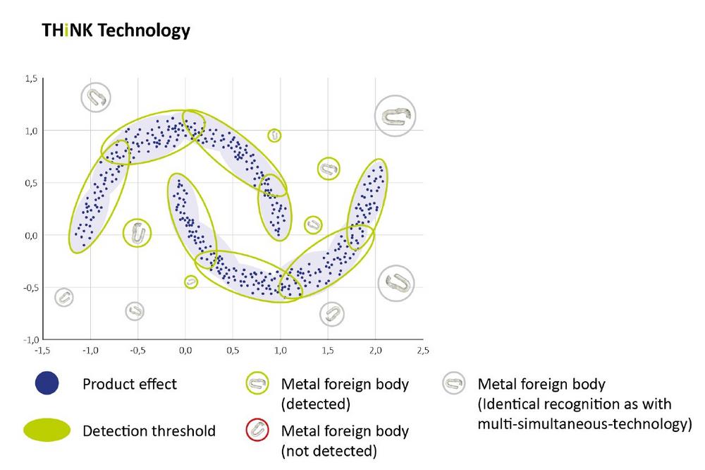 Like conventional metal detectors, THiNK uses multi-simultaneous technology to apply several frequencies to the product being inspected. Using AI technology, THiNK isolates the signals from product effect, creating additional detection thresholds. All signals that lie outside of these thresholds are identified as metallic contaminants. The detection sensitivity increases, but false rejects are reduced by means of more “intelligent” threshold calculation.