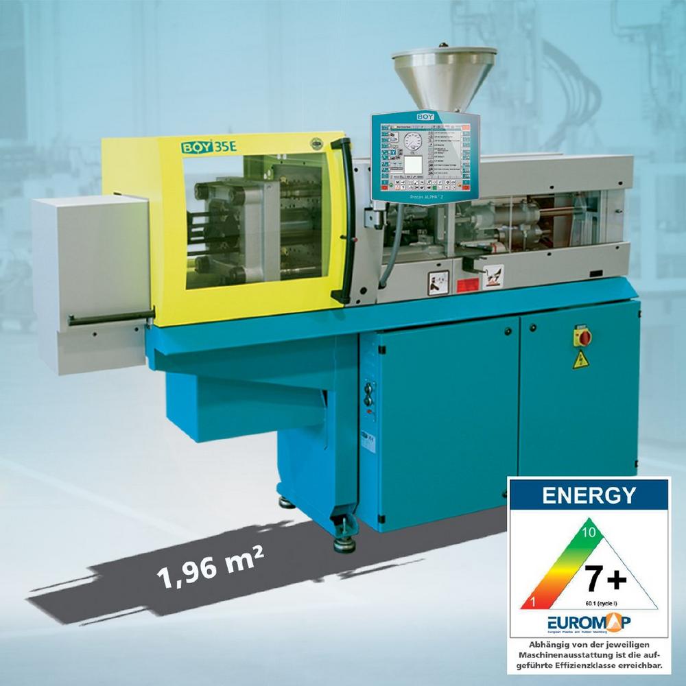 Der vollhydraulische Schneckenkolben-Spritzgießautomat mit Zwei-Platten-Schließeinheit, ausschwenkbarer Spritzeinheit und energieeffizientem Servo-Antrieb verfügt nachweislich über geringste Maschinenstundensätze. Ausgestattet mit der optional erhältlichen EconPlast-Plastifiziereinheit reduziert sich der Energieverbrauch einer BOY 35 E deutlich. Ausgezeichnet mit der  Effizienzklassifizierung 7+ gemäß Euromap 60.1 (Energieverbrauch nur 0,49 kWh/ kg Materialdurchsatz), behauptet die BOY 35 E einen unerreichten Spitzenplatz in ihrer Schließkraftklasse.
