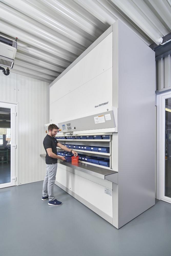 Ein weiterer Hänel Rotomat® Lagerlift dient in der Produktionshalle des Unternehmens als zentrales Lager für Rohmaterial und Montageteile.