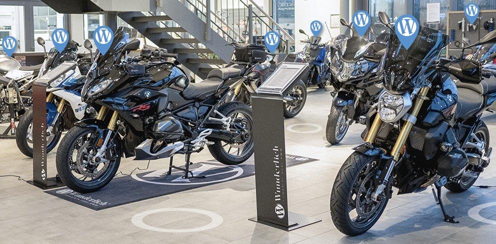 Zu den ausgestellten Motorrädern können sich die Besucher abhängig vom jeweiligen Modell die Bild- und Videogalerie und die komplette Fahrzeugausstattung anschauen, sich darüber informieren, eine Merkliste anlegen und direkt einkaufen. Wunderlich stellt dabei für seine Kunden immer das jeweilige Motorrad in den Mittelpunkt und danach erst die passenden Komponenten. Damit stellt man sicher, dass der Kunde, die zu seiner eigenen BMW passenden Komponenten leicht findet. Nicht zu vergessen: Auch ein informativer Blick in das Werkstatt Service-Center, das sich an den Showroom anschließt, ist möglich.