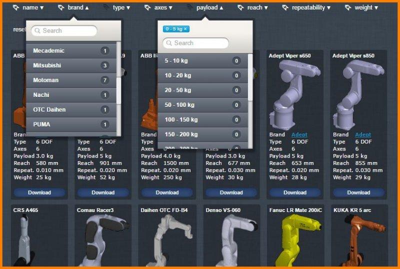 RoboDK bietet eine umfangreiche Bibliothek von Industrieroboterarmen, externen Achsen und Werkzeugen von über 50 verschiedenen Herstellern.