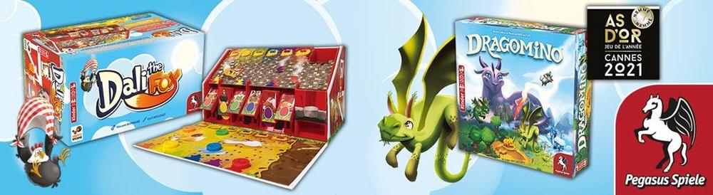 Bereits im November und Dezember hat Pegasus Spiele das Kinderspielsortiment um weitere Titel (Timmy im Zoo, Mary Magica, Schneckenslalom, Kanonen & Dublonen) in der erfolgreichen Pünktchen-Reihe erweitert. Voraussichtlich Mitte März erscheint darüber hinaus ein weiteres außergewöhnliches Kinderspiel: Dali the Fox von Vincent Bonnard. Als der Fuchs Dali begeben sich zwei bis vier Spielende auf die Jagd nach Eiern im Hühnerstall von Bauer Salvador. Dazu müssen sie jedoch geschickt dem Bauern ausweichen und nicht zu viel riskieren. Würfel zeigen in jeder Runde an, welche Eierfarbe gewählt werden darf. Dabei darf der aktive Spielende nach jedem Wurf entscheiden, den Zug zu beenden oder nochmals zu würfeln, um noch mehr Eier zu ergattern. Doch das ist risikoreich und misslingt der Wurf, sind alle Eier dieser Runde verloren. Dali the Fox ist ein schnell gespieltes Spiel für Kinder und Familien ab sechs Jahren mit einem außergewöhnlichen 3D-Aufbau des zentralen Spielelements, dem Hühnerstall. Dieser hat nicht nur sechs Fächer für die insgesamt 36 Eier, sondern auch einen integrierten Würfelturm im Schornstein. Nach dem Spielen kann der Hof mit wenigen Handgriffen eingeklappt und die Spielschachtel über den Hühnerstall gestülpt werden. So entfällt langes Aufbauen bei der nächsten Partie.