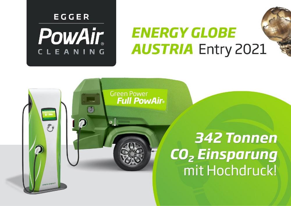 Im Bereich „Climate Action“ setzt sich Egger PowAir folgendes Ziel: Die bis dato mit Diesel betriebenen Kompressoren, die für die Druckluft-Reinigung zum Einsatz kommen, werden künftig vollständig durch Elektro-Kompressoren ersetzt. Diese wiederum beziehen ihre Energie zu 100% aus grünem Strom.
