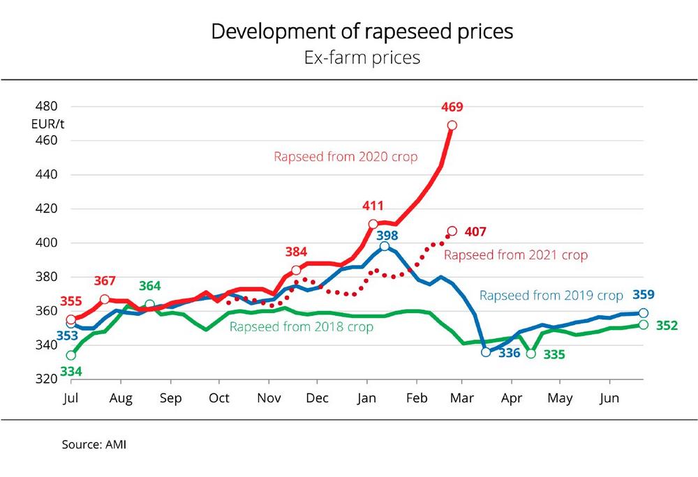 Whereas at the end of January, the price was reported at EUR 411 per tonne free to warehouse, it was up to EUR 469 per tonne only five weeks later. Such a strong price increase has not been witnessed in the past decade. There is no end in sight for soaring rapeseed prices.