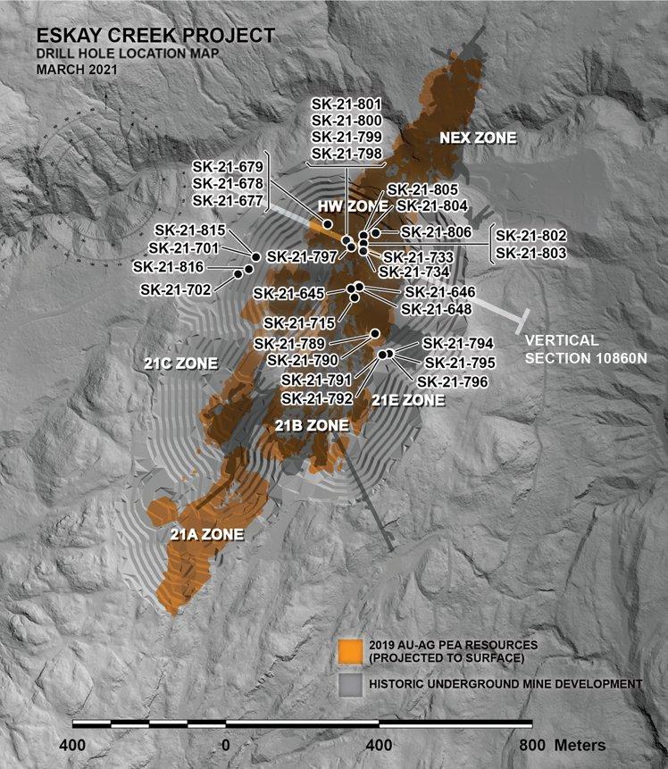 Die Mineralisierung innerhalb der Zone 21C hat sich in die Tiefe ausgedehnt, wie der Phase-2-Bohrabschnitt 2021 mit 2,82 g/t Au, 57 g/t Ag (3,58 g/t AuEq) auf 49,00 m (SK-21-679) in einer Kombination aus Contact Mudstones und Rhyolite Breccias bestätigt. Das nächstgelegene historische Bohrloch durchschnitt mit 4,04 g/t AuEq auf 25,99 m (C011099) einen vergleichbaren Gehalt, jedoch über eine geringere Breite. Eine weitere hochgradige Gold-Silber-Mineralisierung wurde von einem flankierenden Bohrloch durchteuft, das 7,10 g/t Au, 406 g/t Ag (12,51 g/t AuEq) auf 19,15 m (SK-21-678) im Contact Mudstone mit einem zweiten Rhyolith-haltigen Abschnitt mit einem Gehalt von 2,87 g/t Au, 7 g/t Ag (2,97 g/t AuEq) auf 18,40 m durchschnitt.