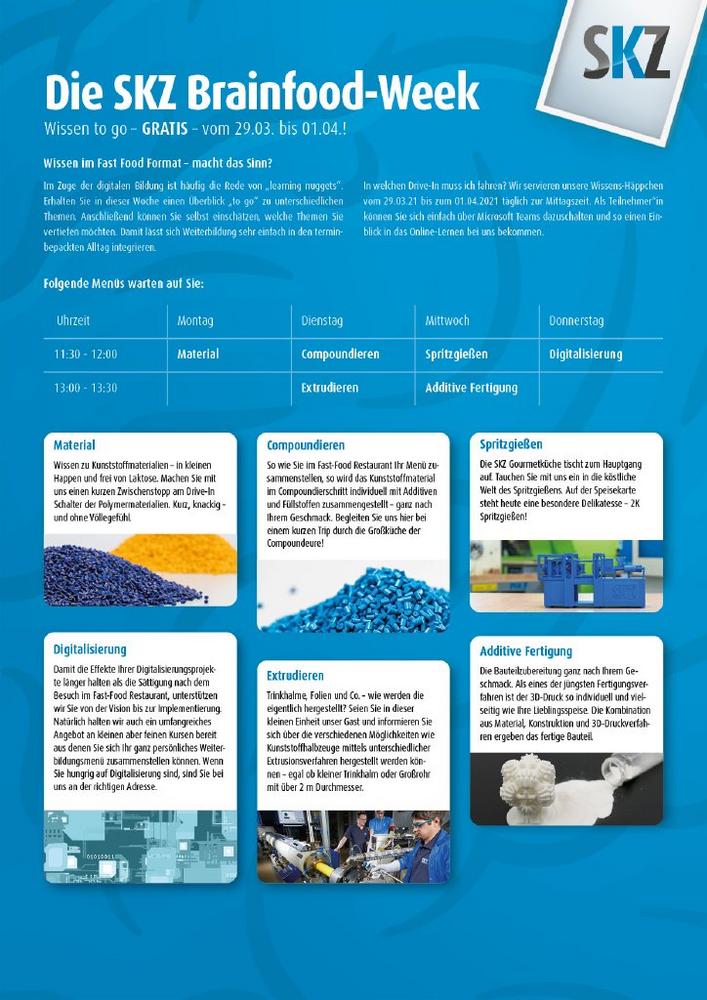Wie bereits aus den Online-Kursen des SKZ gewohnt, wurden alle mögliche Mittel der digitalen Kommunikation genutzt. Zu den Vorträgen spielten die Referenten zusätzliche Umfragen ein, die über den Chat diskutiert und anschließend mit den Teilnehmenden spontan in der Session besprochen wurden. „Mit diesem Format haben wir nicht nur Einzelpersonen vor die Bildschirme locken können – teilweise haben ganze Abteilungen in den Unternehmen an den Rechnern gesessen. Die durchweg positiven Feedbacks der Teilnehmer/-innen haben dieses neue Format bestätigt und wir sind bereits in der Planung zur nächsten SKZ Brainfood Week“, so Matthias Ruff abschließend. Die nächste SKZ Brainfood Week ist für das zweite Halbjahr 2021 geplant und wird wieder für alle Interessierten kostenfrei erreichbar sein. Alle Videos der ersten Ausgabe gibt es auf der Website des SKZ in voller Länge zu sehen. https://www.skz.de/bildung/brainfood
