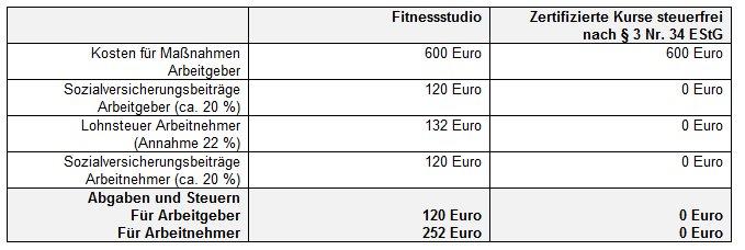 Der Arbeitgeber möchte die Gesundheit seiner Arbeitnehmer fördern und überlegt, entweder die Fitnessmitgliedschaft bis 600 Euro anzubieten oder die Kosten für zertifizierte Kurse bis zu 600 Euro zu übernehmen.