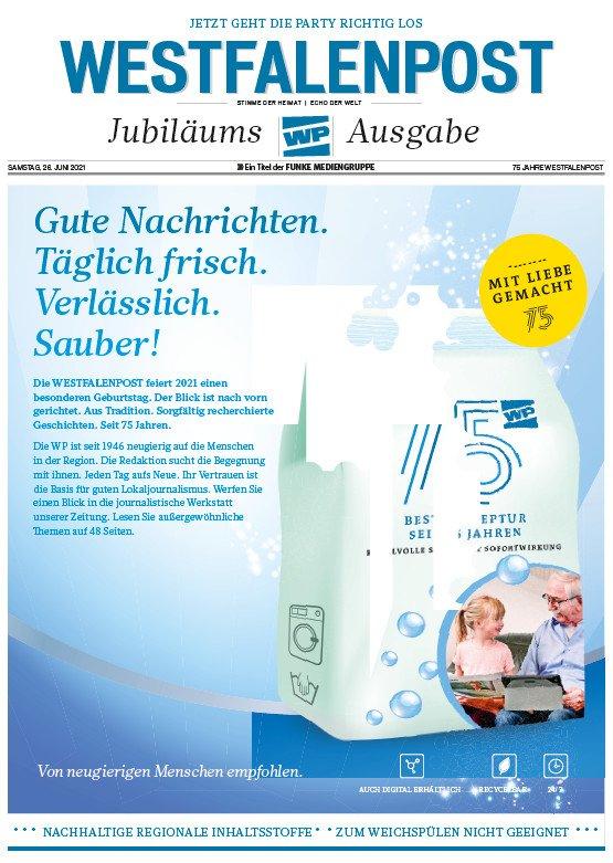 FUNKE feiert das 75-jährige Jubiläum ihrer Westfalenpost (WP): Das Team der Zeitung mit Hauptsitz in Hagen präsentiert seinen Leserinnen und Lesern in der Mitte des Jubiläumsjahrs nicht nur ein fast 50-seitiges Magazin. In den kommenden Monaten folgen im gesamten Verbreitungsgebiet Aktionen für die Leserschaft in allen Städten und Gemeinden der Lokalredaktionen. Die größte wird eine 5 x 75 Kilometer lange „Tour de WP“ durch Südwestfalen sein.