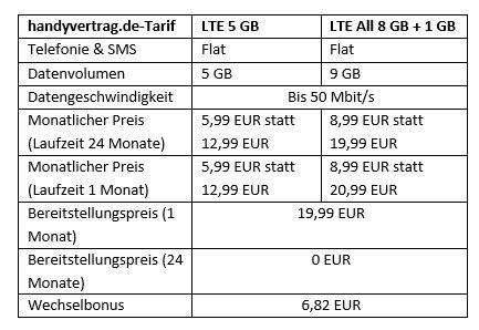 handyvertrag.de, ein Mobilfunkangebot der Drillisch Online GmbH, reduziert die Preise für zwei LTE-Tarife um über 50 Prozent. So steht der Tarif LTE All 5 GB ab sofort für 5,99 EUR anstatt 12,99 EUR monatlich bereit. Für Nutzer, die einen höheren mobilen Datenbedarf haben stellt handyvertrag.de den Tarif LTE All 8 GB + 1 GB zum Aktionspreis zur Verfügung. So kostet der Handyvertrag mit 9 GB Datenvolumen über die gesamte Vertragslaufzeit hinweg 8,99 EUR monatlich. Neben dem Datenvolumen beinhalten beide Tarife eine Doppel-Flat für SMS und Telefonie.
