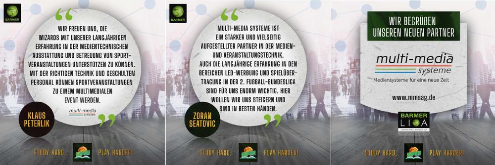 „Mit multi-media systeme haben wir einen starken Partner an unserer Seite, der im Bereich Medien und Veranstaltungstechnik sehr vielseitig aufgestellt ist. Nicht nur das ist für uns enorm wichtig, sondern auch die langjährige Erfahrung in den Bereichen LED-Werbung und Spielübertragung in der 2. Fußball-Bundesliga. Hier wollen wir uns steigern und sind meiner Meinung nach in den besten Händen“, so Wizards Manager Zoran Seatovic. Klaus Peterlik, Vorstandsvorsitzender der multi-media systeme, erklärt: „Wir freuen uns, die Wizards mit unserer langjährigen Erfahrung in der medientechnischen Ausstattung und Betreuung von Sportveranstaltungen unterstützen zu können, denn mit der richtigen Technik und geschultem Personal können Sportveranstaltung zu einem multimedialen Event werden. Daneben passt für uns als ortsansässiges Familienunternehmen regionales Sport-Sponsoring hervorragend in unser Konzept.“