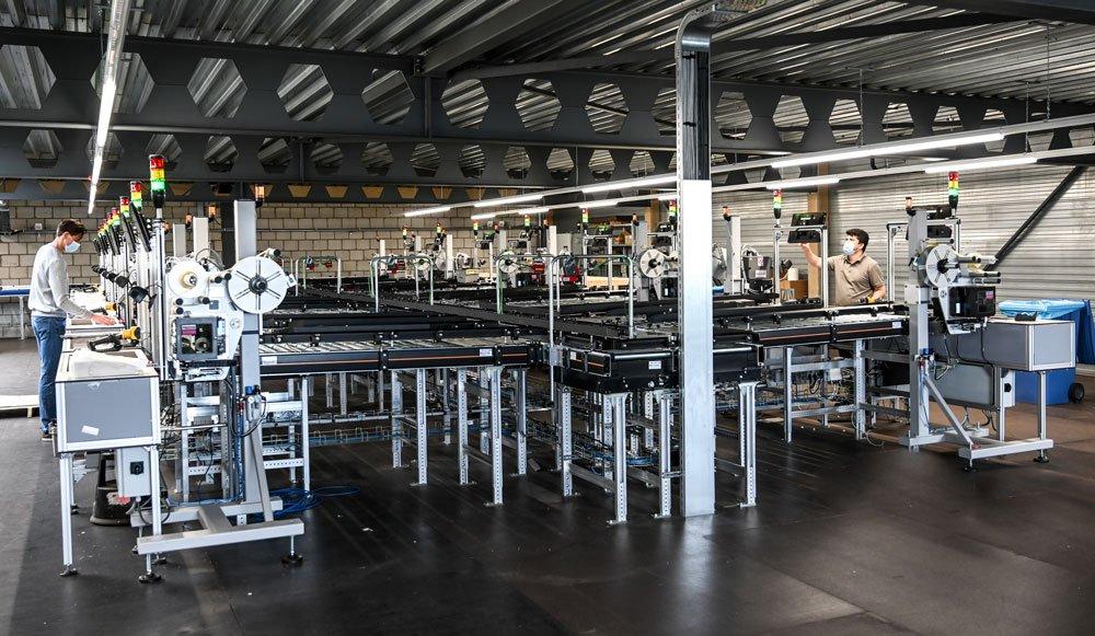 Für den weiteren Verlauf der Zusammenführung und Versandbereitstellung wird pro Artikel ein Patientenetikett gedruckt und auf der Artikel aufgebracht. Unterstützt von einem Pick-to-Light-System werden die Artikel je Patient oder Rezeptvorgabe auf transparente, sogenannte Blockbeutel verteilt und zusammengefasst. Sensible Sensortechnik überprüft dabei, ob die einzelnen Artikel tatsächlich in den richtigen Blockbeutel eingelegt wurden. Die Beutel sind unter einem Gitterrost auf der Arbeitsfläche der Stationen angebracht – pro Arbeitsstation 20 Zielbeutel respektive Einzelaufträge. Wenn alle Artikel rezeptgemäß verteilt sind, werden die Blockbeutel einzeln entnommen und ein Patientenetikett gedruckt, das auf der Vorderseite des Blockbeutels angebracht wird. Die Beutel werden schließlich in Ausgangsbehälter gelegt, mit denen die Apotheke in einem Mehrweg-Kreislaufsystem beliefert werden.