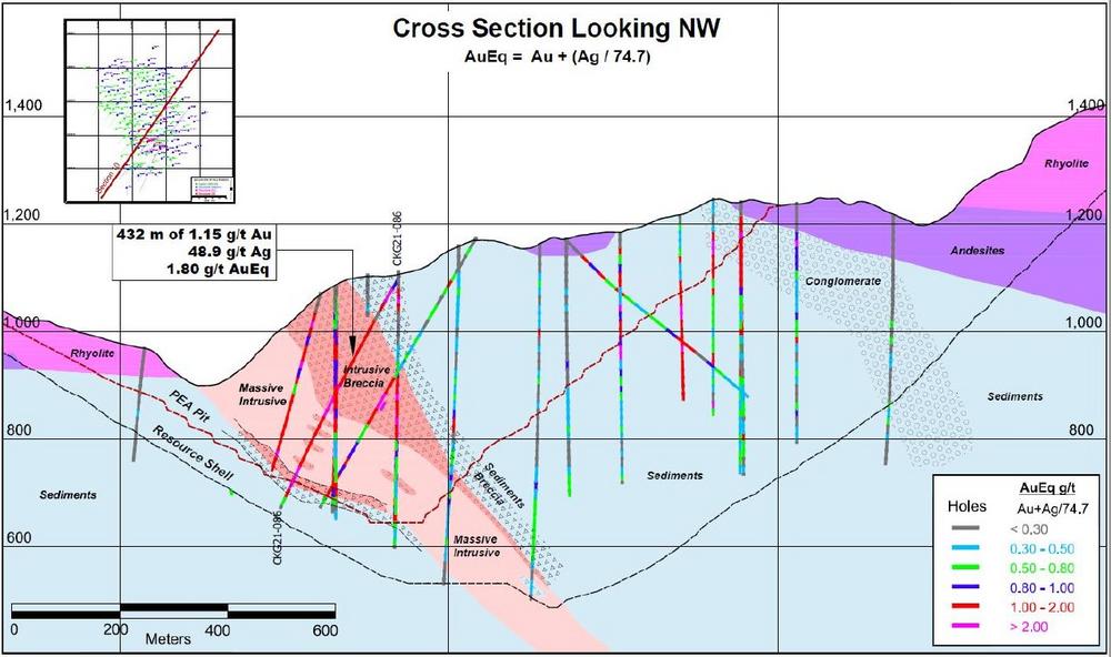 - Recent drill results (including 432 metres of 1.80 g/t gold-silver equivalent @ 75:1 ratio) suggest potential for an even higher-grade core within the Metates intrusive. Chesapeake is evaluating further infill drilling to be incorporated in a PFS.