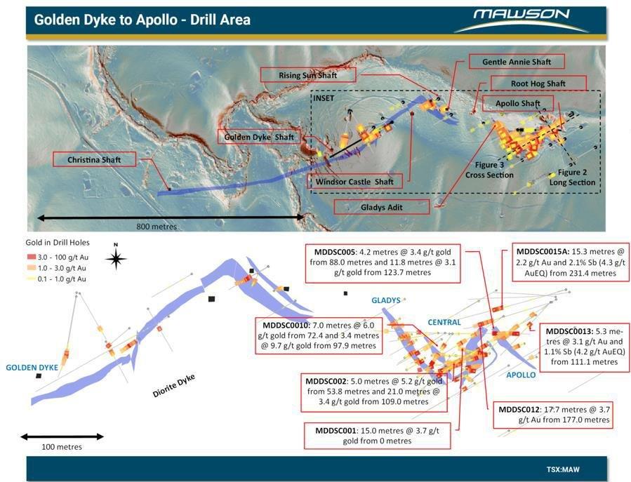 - Diamond drillhole MDDSC015A, the deepest hole drilled to date at the Apollo mine area (Tables 1-3, Figures 1-3) intersected (lower cut of 0.3 g/t Au cut over 2.0 metre width, with higher grades reported with a 5 g/t Au cut over 1.0 metre):
