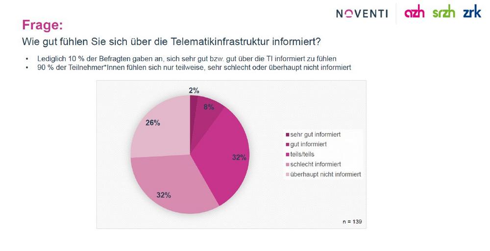 Fehlende Informationen oder Unwissenheit rund um die Telematikinfrastruktur werden als Hauptgründe angegeben, aus denen sich TherapeutInnen noch nicht vorzeitig an die TI anbinden lassen wollen. 90% der TeilnehmerInnen fühlt sich nur teilweise, schlecht oder überhaupt nicht informiert.