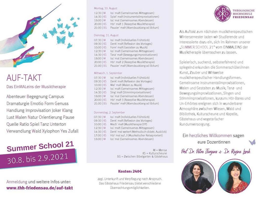 Die Summer School 2021 wird das Spektrum musiktherapeutischer Handlungsformen vorstellen. Die beiden Wissenschaftlerinnen, Frau Prof. Dr. Petra Jürgens (Leiterin des Studiengangs M.A. Musiktherapie an der ThHF) und Frau Dr. Regina Lorek (M.A. Musiktherapie), die die Summer School veranstalten, beschreiben das vielfältige Programm so: „Zur Summer School 21 sind Interessierte eingeladen, sich vom Einmaleins der Musiktherapie überraschen zu lassen. Die Teilnehmerinnen und Teilnehmer erfahren spielerisch die Kunst, den Zauber und die Wirkungsweise musiktherapeutischer Handlungsformen. Gemeinsam wird improvisiert, gemalt, gestaltet, gesungen.“ Die Veranstaltung ist gleichzeitig vorbereitender Auftakt zum Wintersemester 2021/22.