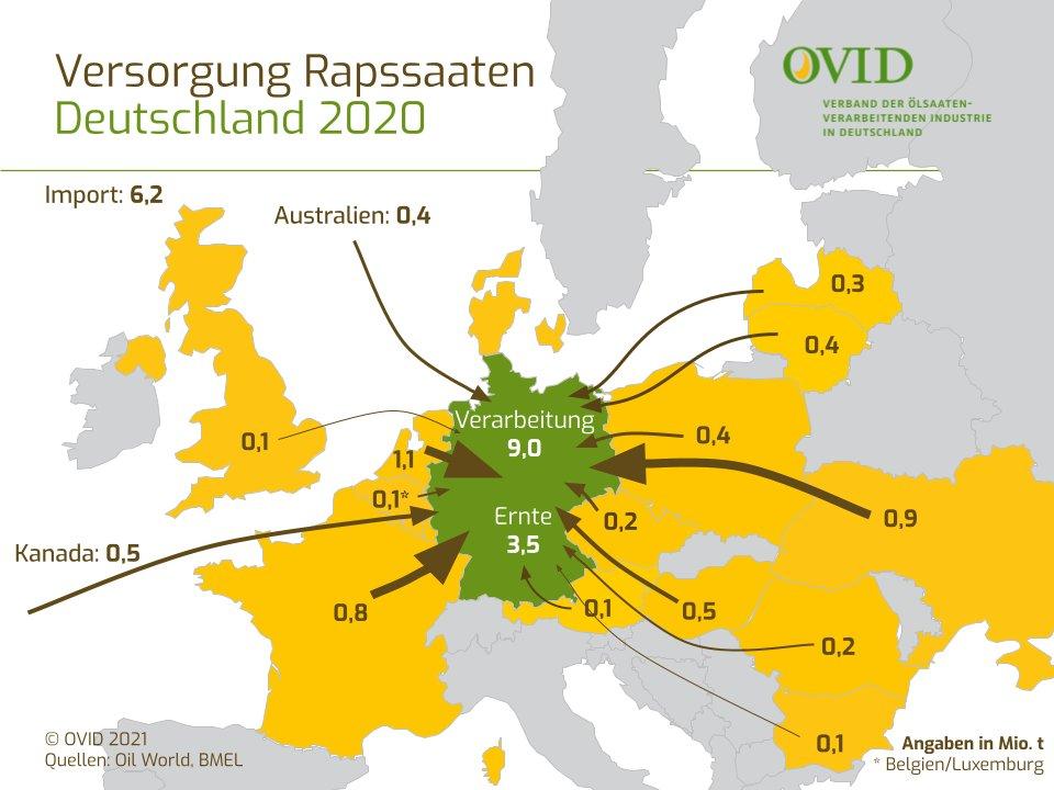 Deutschlands Ölmüller verarbeiteten im letzten Jahr mit 9 Millionen Tonnen deutlich mehr Rapssaaten als heimische Äcker hergaben. 2020 wuchsen rund 3,5 Millionen Tonnen der Ölsaat auf einer Million Hektar. Zusätzlich importierte Deutschland etwa 6,2 Millionen Tonnen. Ein Großteil der Ware stammte aus Ländern wie der Ukraine, Frankreich oder Ungarn. Importe aus Kanada und Australien haben in den Jahren an Bedeutung gewonnen.