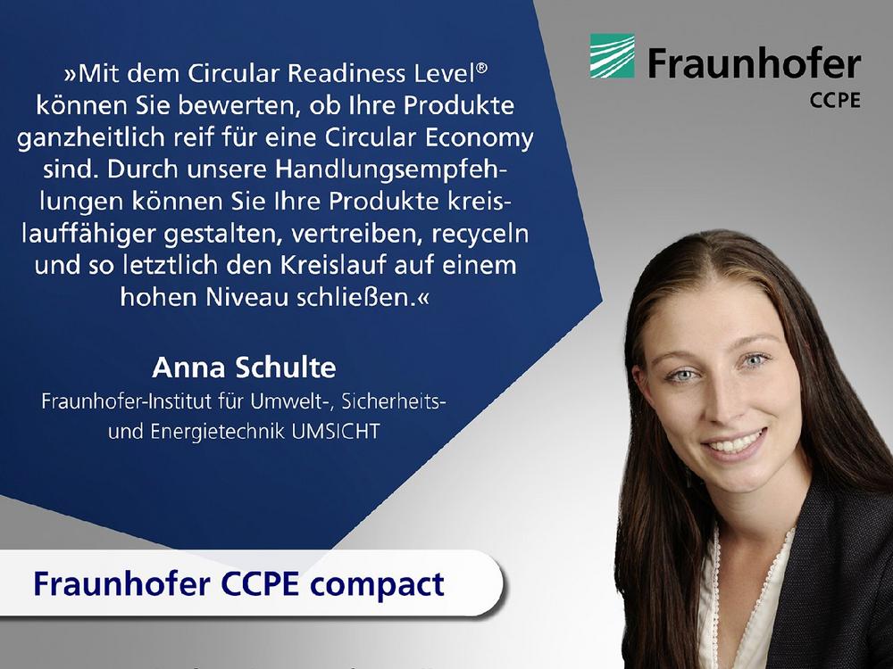 Wie können Produkte und Produktsysteme zirkulärer gestaltet werden? Welche Handlungsfelder spielen hier eine Rolle? Wie kann dies getestet werden? Das Fraunhofer UMSICHT entwickelte genau für diese Fragen zusammen mit dem Fraunhofer IML das Self-Check Tool Circular Readiness Level® (CRL), das in der Veranstaltung »Fraunhofer CCPE compact« am 28. Oktober von 14.00 bis 16.00 Uhr im Mittelpunkt steht. Die Veranstaltung ist kostenlos, Anmeldeschluss ist der 21. Oktober. Anna Schulte vom Fraunhofer UMSICHT erläutert bereits im Kurzinterview, was genau hinter CRL® steckt.