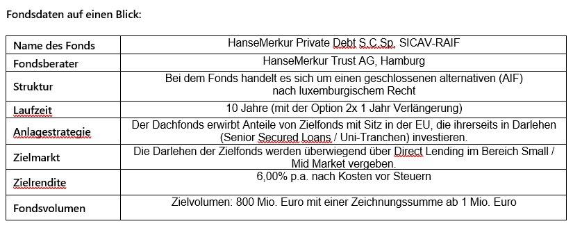 Der Asset Manager der HanseMerkur, die HanseMerkur Trust AG, Spezialist für Absolute Return und Wertsicherungsstrategien für institutionelle Anleger, weitet ihre Geschäftstätigkeit um den Bereich Alternatives (Private Markets) aus. Der Fokus des neuen geschlossenen Dachfonds HanseMerkur Private Debt S.C.Sp, SICAV-RAIF liegt auf Cashflow-starken europäischen Klein- und Mittelstandsunternehmen in defensiven, nicht-zyklischen Sektoren wie dem Gesundheitswesen oder der Softwarebranche.