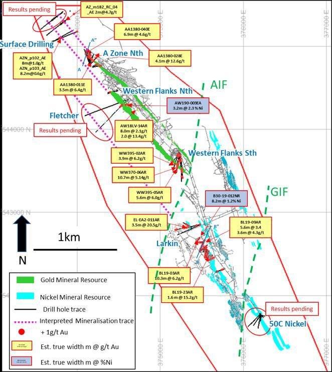 Western Flanks Nickel: Selected holes targeting the up-dip position of the Western Flanks gold mineralization were extended to test for contact-related nickel mineralization. AW190-003EA returned a significant result of 2.3% Ni over 3.2 metres (estimated true width). The Western Flanks nickel mineralization is typically more complex, related to multiple thrusting, compared to the Beta nickel troughs to the south, however, the recent results continue to provide encouragement to further assess nickel mineralization in this area.