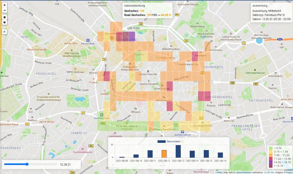 Um dies zu erreichen, statteten die Forschungspartner 15 Busse der Aachener Straßenbahn und Energieversorgungs-AG (ASEAG) mit einer eigens entwickelten, niedrigpreisigen Sensorik zur Datenerfassung und einer Geotab GO-Telematikeinheit zur Übertragung der gewonnenen Luftqualitätsdaten aus. Über einen auf dem Dach angebrachten Schlauch wurde die Außenluft mithilfe einer Vakuumpumpe angesaugt und die Messdaten, versehen mit den jeweiligen GPS-Koordinaten, in einer Datenbank gesammelt. Das so aufgebaute IoT-Netz ermöglicht den Echtzeit-Abruf von Daten. Zur anschließenden Beurteilung der Luftqualität entwickelten das FIR und Geotab eine Luftqualitätskarte. Sie visualisiert die Daten in einer über die Stadtkarte gelegten Heatmap und ermöglicht damit eine intuitive wie objektive Beurteilung der Luftqualität zu jeder Tageszeit, für jeden städtischen Bereich.